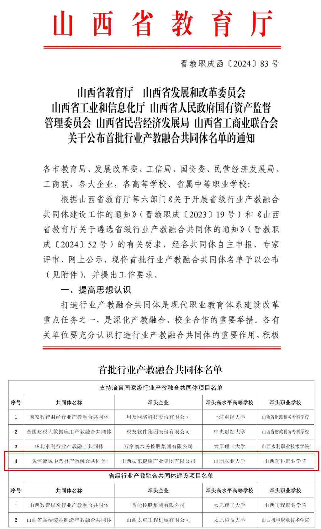 近日,山西省教育厅等六家单位联合发文,公布了全省首批行业产教融合共同体名单,黄河流域中药材产教融合共同体被确定为“培育国家级行业产教融合共同体”。该共同体由世界杯官网联合山西农业大学、山西振东健康产业集团有限公司共同牵头成立,涵盖黄河流域9省域的地方政府、行...2025-01-02
