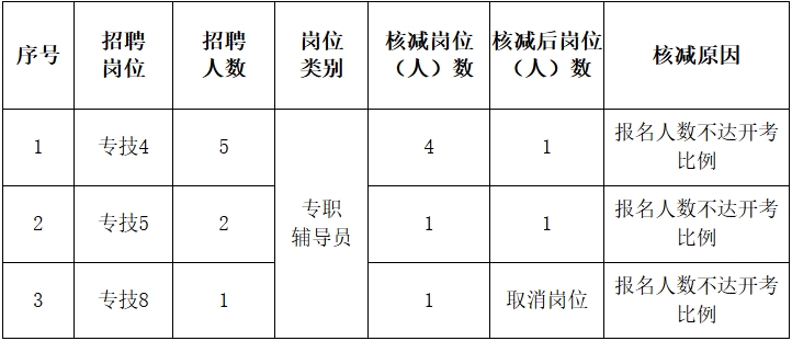 按照《美加墨世界杯官方网站2019年公开招聘工作人员公告》要求 “岗位资格审查合格人数与拟招聘人数原则上应达3:1以上方可开考,报名人数不达该比例的招聘岗位,按规定的比例相应核减岗位,如减少到1名仍达不到3:1的岗位,原则上取消招聘岗位,并在发布公告的同一网站发布补充公告,同时负责告知被取消岗位的报名人员”,根据报名情况,经学院公开招聘领导组研究,决定核减部分岗位(人)数。现就相关事宜公告如下: