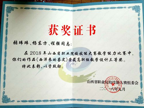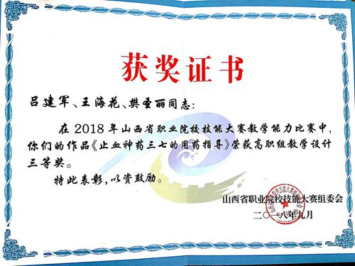在刚刚落下帷幕的2018年山西省职业院校技能大赛教学能力比赛中,世界杯官网教师取得高职组信息化教学设计比赛二等奖一项、三等奖三项的好成绩,其中,贾文雅、王祎、赵敏的作品《转场动画》获教学设计二等奖,吕建军、王海花、樊圣丽的作品《止血神药三七的用药指导》获教学设计三等奖,张玮玮、杨东方、程强老师的作品《西洋参的鉴定》获教学设计三等奖,张府君、郝晶晶、孙靓的作用《黄曲霉素检测》获教学设计三等奖。并且张玮玮、杨东方、程强老师的作品还被省教育厅选送参加2018年全国职业院校教学能力比赛,这充分展示了世界杯官网教师过硬的教育教学水平和综合素质,也反映出世界杯官网在教育教学改革、师资队伍建设等方面的建设成果。