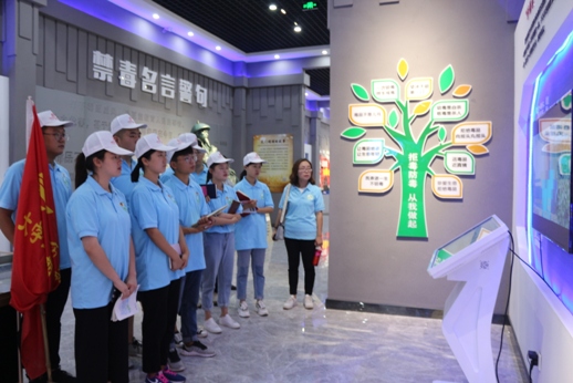 为了加深对毒品的认识,更深刻直观地了解毒品对人们身心的危害,7月12日上午,赴襄垣暑期社会实践团全体队员在团县委何勇书记的带领下,参观襄垣县毒品预防教育基地。实践团队员一到禁毒教育基地,就被墙上的大字“全党动员,全民参与,打赢打胜禁毒人民战争”的标语所吸引,为什么禁毒会成为战争?大家带着深深的疑问进入了展厅。参观过程中,实践队员马子烜亲身体验“吸毒后的你”,当看到吸毒后不同年份自己的面貌时,队员们都瞬间惊愕不已。通过观看禁毒微电影“浪漫金色阳光”和吸毒者的忏悔录后,让大家更加深刻地了解到毒品的本质及毒品给人民和社会带来的危害。