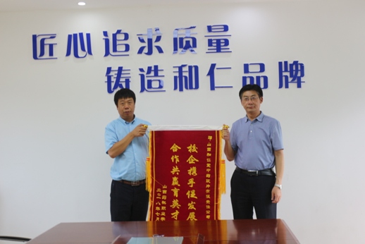 7 月13日上午 ,学院党委书记张瑞芳,党委委员、副院长王仙芝一行,同山西楼东工贸集团党委书记赵成书冒雨前往学生驻地,看望暑期社会实践学生。张书记充分肯定了实践团的活动成果,鼓励实践队员们珍惜实践机会,把实践体会转化成奋斗的动力,实现自我成长。最后,张书记还代表学院向楼东俊安集团表达了感谢,并赠送题有“校企携手促发展,合作共赢育英才”的锦旗。