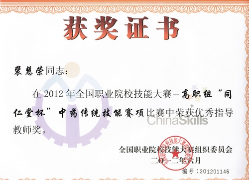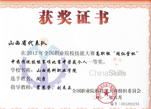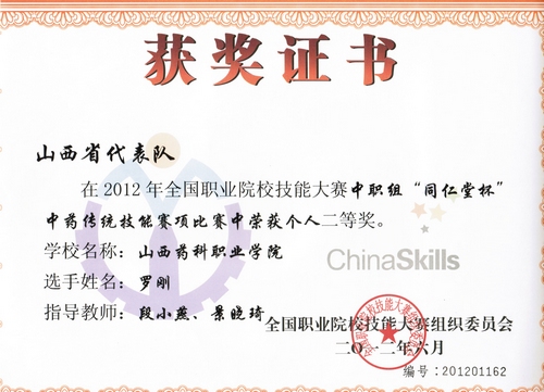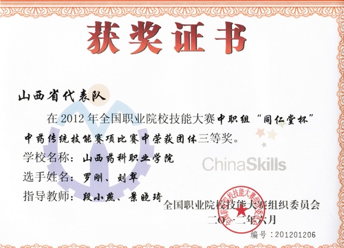 由国家教育部、国家中医药管理局联合举办的2012年全国职业院校技能大赛----“同仁堂杯”中药传统技能大赛于6月14日在山东中医药高等专科学校落下帷幕,世界杯官网参赛选手表现不俗,喜获佳绩,取得历史性突破:荣获高职组团体一等奖、中职组团体三等奖;闫彦、范玉琴两名同学双双捧得高职组个人一等奖,罗刚同学荣获中职组个人二等奖;裴慧荣、刘来正两名教师分获优秀指导教师奖。