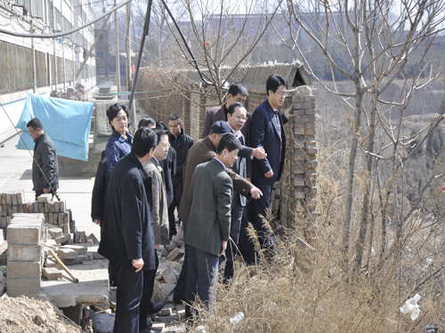 图为汤部长一行到学院学生公寓楼护坡进行实地考察