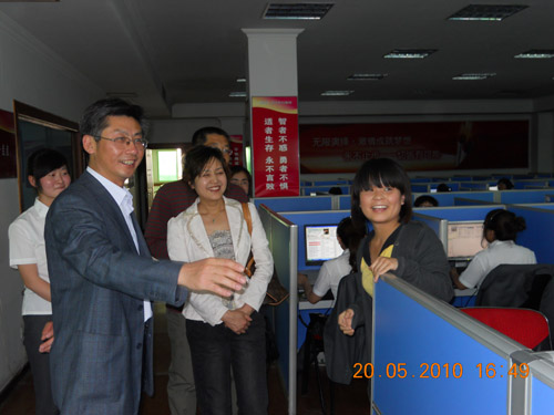图为在昂生企业的电话营销中心与世界杯官网学生交谈