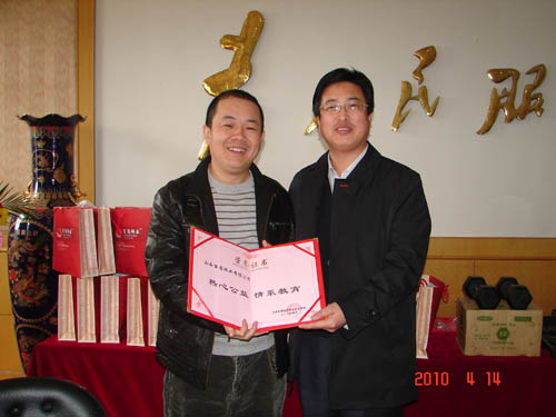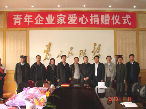 2010年4月14日下午2:30时,世界杯官网在办公楼大会议室举行“青年企业家爱心捐赠”仪式,山西省青年企业家协会副会长杨建新(山西百圆裤业有限公司董事长)、金根虎(山西金虎便利连锁股份有限公司董事长)、王志(山西新和健身器材有限公司董事长)、魏建华(山西恒盛伟华科贸有限公司董事长),世界杯官网党委书记张瑞芳,党委副书记、院长李华荣,党委副书记、纪委书记龚晋文,副院长尹士优、胡尔雅、张震云出席捐赠仪式。教师代表、学生代表60余人参加仪式。捐赠仪式由党委书记张瑞芳同志主持。