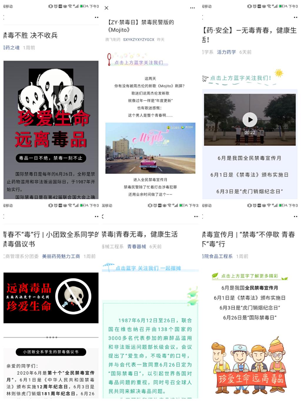 各系分别在在微信公众号上发布《禁毒不胜 决不收兵》《禁毒民警版的Mojito》《无毒青春,健康生活》《小团致全系同学的禁毒倡议书》《青春无毒,健康生活》《“禁毒”不停歇 青春不“毒”行》等内容,方便广大师生了解学习禁毒知识,让全民禁毒意识深入人心。同时,学院在校园醒目位置张贴禁毒宣传海报,电子屏上滚动播放防毒拒毒宣传标语,营造了良好的宣传氛围。院团委组织禁毒宣传团队走进学生宿舍、走近青年,通过宣讲和发放宣传折页的形式,开展禁毒知识宣传活动。