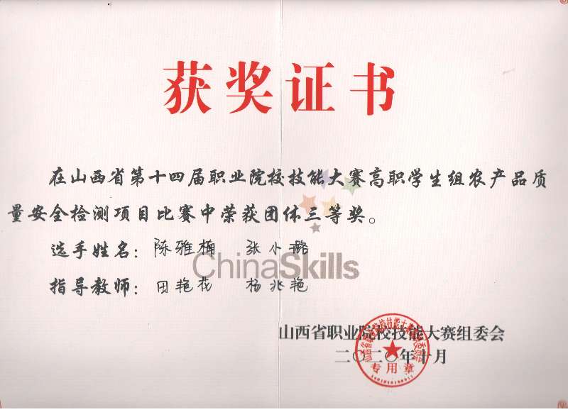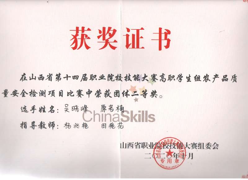 在刚刚落下帷幕的2020年山西省第十四届职业院校技能大赛农产品质量安全检测大赛中,世界杯官网食品工程系学生吴晓峰和原若楠荣获团体二等奖、陈雅楠和张小璐荣获团体三等奖,杨兆艳、田艳花获优秀指导教师称号。