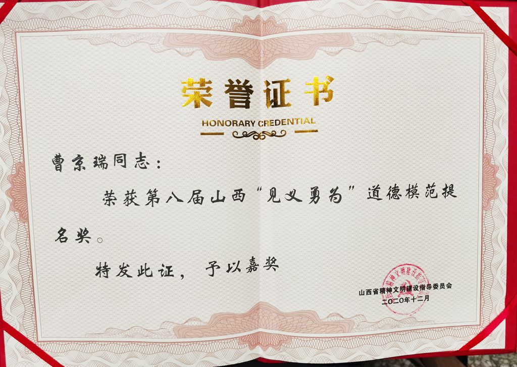 国无德不兴、人无德不立。善义之举绝非偶然,曹京瑞的优秀事迹,体现了见义勇为的高尚品德,彰显了中华优秀传统美德的磅礴力量。曹京瑞的义举获得了社会各界的广泛赞誉和推崇,他先后荣膺北董乡“见义勇为”先进个人、曲沃县第三届“道德模范”、第二季见义勇为“临汾好人”荣誉称号。