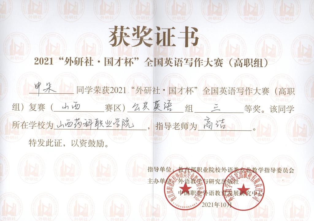 金秋十月,喜报频传。近日,2021 “外研社 ∙ 国才杯”全国英语写作大赛(高职组)、演讲大赛(高职组)山西省决赛圆满落下帷幕,由基础部教师李姝指导的学生潘仙勇荣获写作比赛二等奖,阴丰蔚荣获演讲比赛三等奖;教师高洁指导的学生申朵荣获写作比赛三等奖,武喆宇荣获演讲比赛优秀奖。