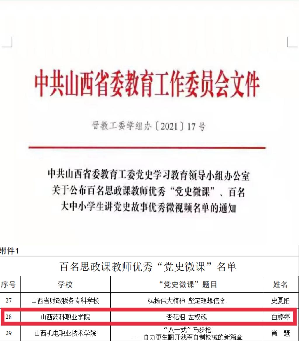 日前,省教育厅以及省委教育工委党史学习教育办公室分别公布了2021年度山西省职业教育教学名师名单和百名思政课教师优秀“党史微课”名单。世界杯官网教师杜月莲获得“2021年度山西省职业教育教学名师”荣誉称号,教师白婷婷主讲的《杏花泪 左权魂》入选百名思政课教师优秀“党史微课”。