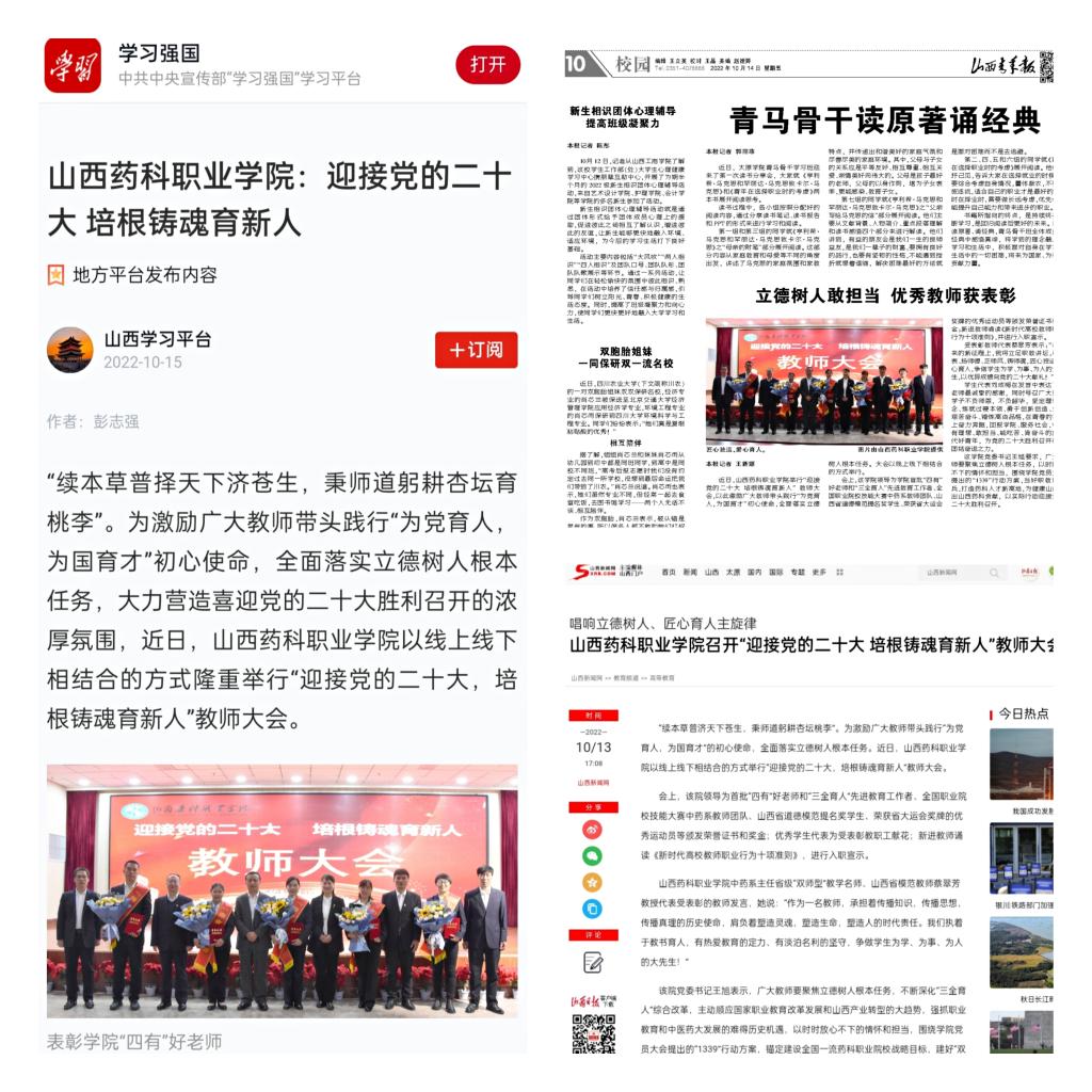 近日,学习强国、山西青年报、山西新闻网等媒体分别对世界杯官网“迎接党的二十大,培根铸魂育新人”教师大会进行了宣传报道。