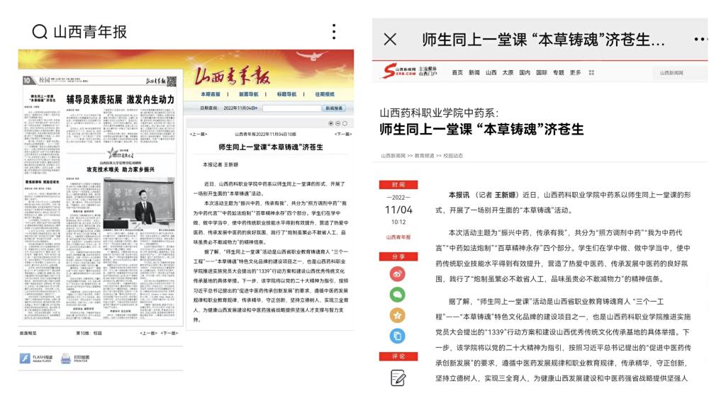11月4日,山西青年报、山西新闻网等媒体平台对世界杯官网师生同上一堂课“本草铸魂”济苍生活动进行了宣传报道。