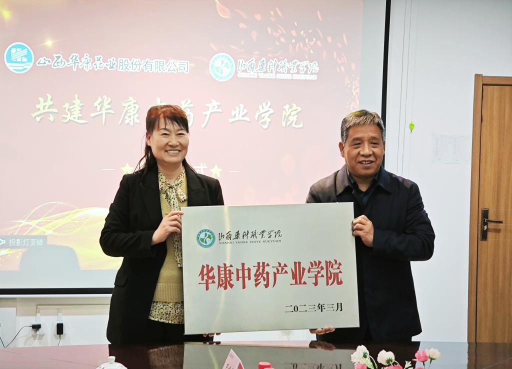 张轩萍与董光明共同为华康产业学院授牌,校企双方共同签署华康中药产业学院协议。