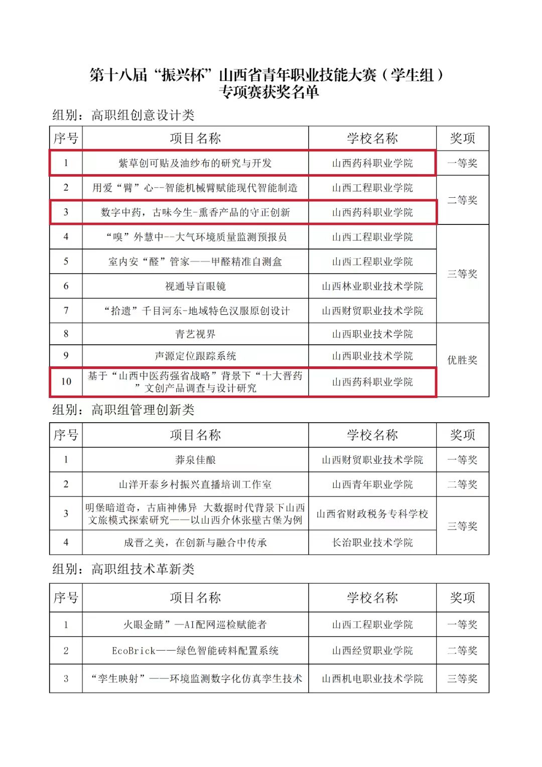 金秋菊香,硕果盈枝。近日,由共青团山西省委、山西省教育厅、山西省人力资源和社会保障厅共同主办的第十八届“振兴杯”山西省青年职业技能大赛(学生组)在太原落下帷幕,世界杯官网参赛队伍团结协作、顽强拼搏,在众多参赛队伍中脱颖而出,取得优异成绩。其中,“紫草创可贴及油纱布的研究与开发”项目荣获一等奖,“数字中药,古味今生——熏香类产品的守正创新”项目荣获二等奖,“‘十大晋药’文创产品调查与研究设计”荣获优胜奖。