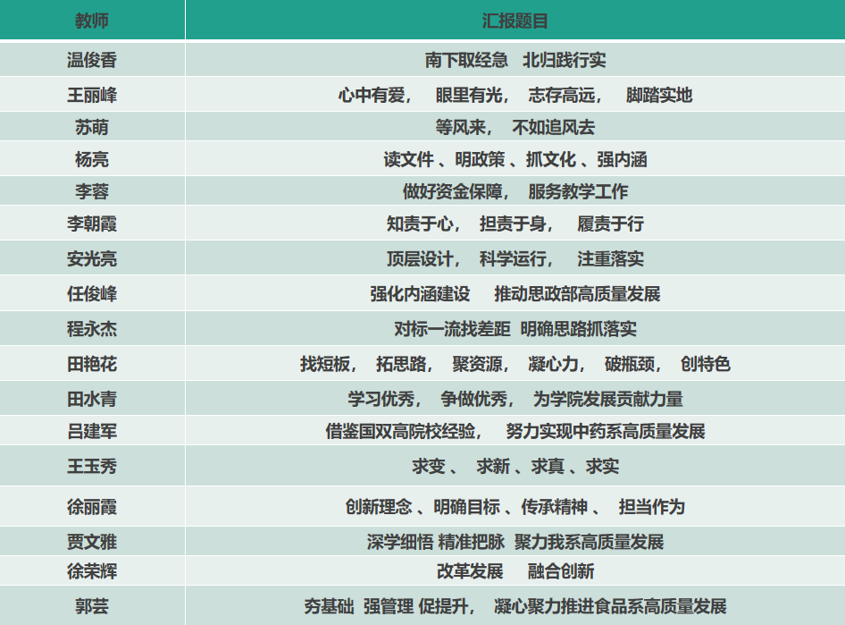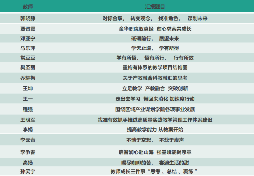 交流会上,50位参训教师结合金华职院学习的所听、所感和所获,联系工作实际,分享了金华职院“抬头看路,志存高远”的办学理念,“服务当地,产教融合”的办学思路,“环境育人、润物无声”的校园文化,使与会人员进一步领略了金职人“深耕职教、追光前行”的责任担当,“提振专业、潜心诣学”的治学风范和“干在实处、久久为功”的务实作风。