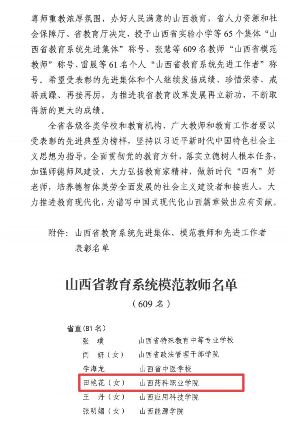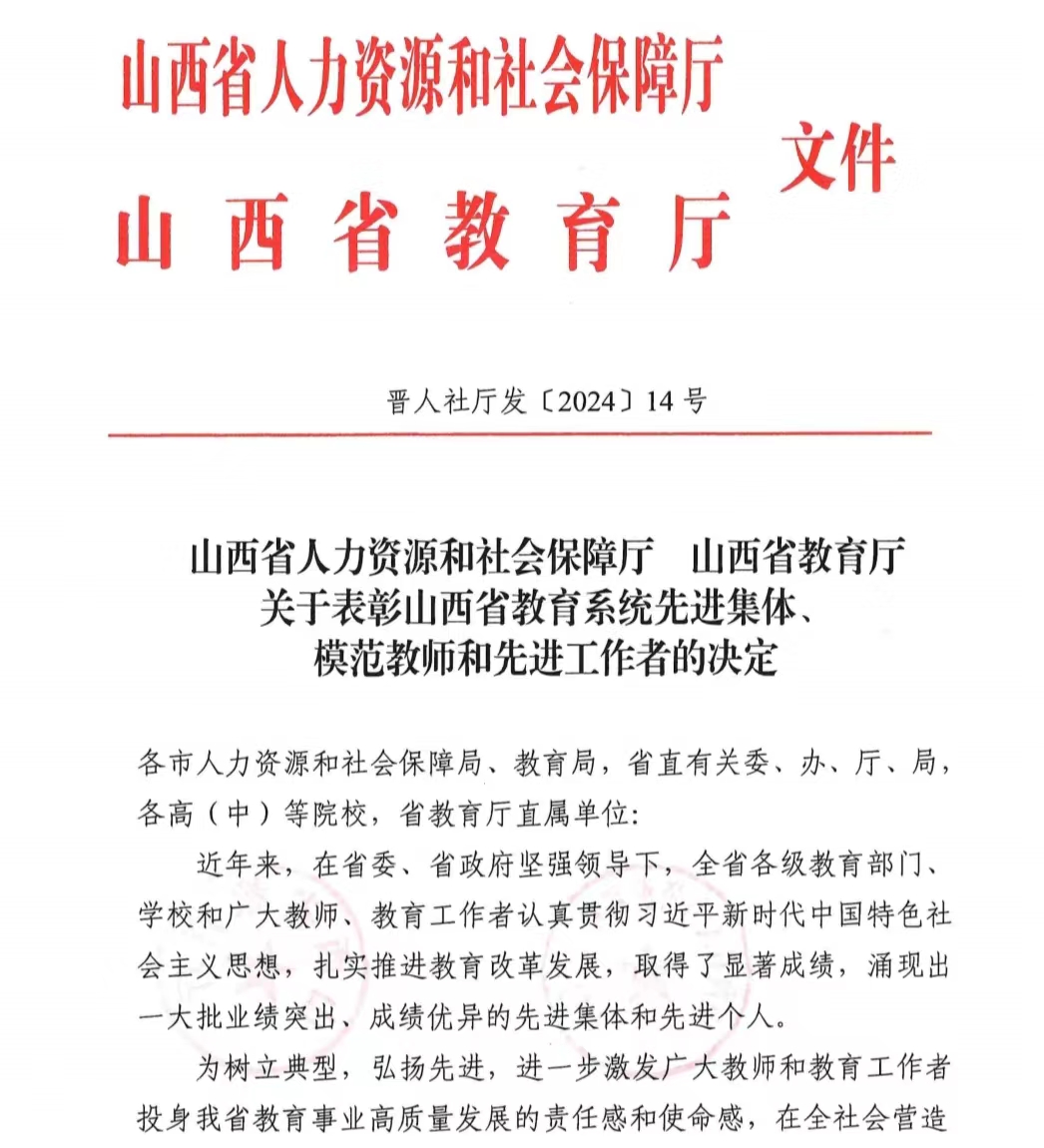 近日,山西省人力资源和社会保障厅、山西省教育厅联合下发《关于表彰山西省教育系统先进集体、模范教师和先进工作者的决定》(晋人社厅发[2024]14号),世界杯官网田艳花老师荣获“山西省教育系统模范教师”称号。