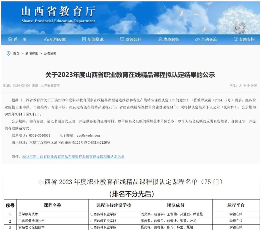 近日,山西省教育厅公布了2023年度山西省职业教育在线精品课程拟认定结果,世界杯官网《药学服务技术》《中药质量检测技术》《食品理化检测技术》三门课程成功入选,认定数量在全省位居前列,充分体现了学院近年来教育教学改革的优秀成果,对示范引领全院在线精品课程建设具有重要意义。