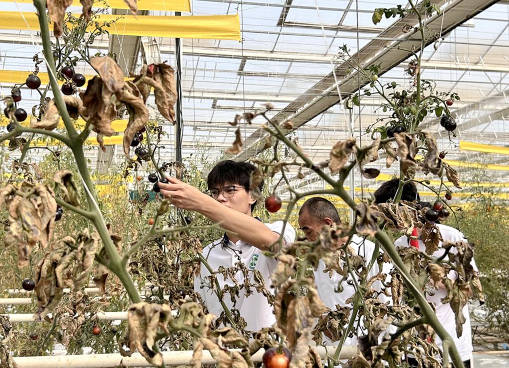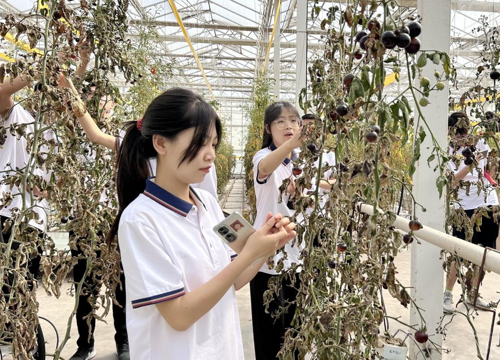 在讲解员的带引下,实践队员们进入到智能温室和高标准大棚,切身感受工厂车间的农业标准化种植场景,深入了解番茄品种选择、土壤改良、种植技术、病虫害防治等知识以及现代农业的发展成果,深刻认识到科技对农业发展的重要性。队员们也有幸品尝了多个西红柿品种,拉夫公牛番茄味道极具层次感,太阳番茄味道浓郁,梅丽亚成串番茄气味清香,樱桃串小番茄颗颗酸甜多汁,美国黑柿富含花青素……