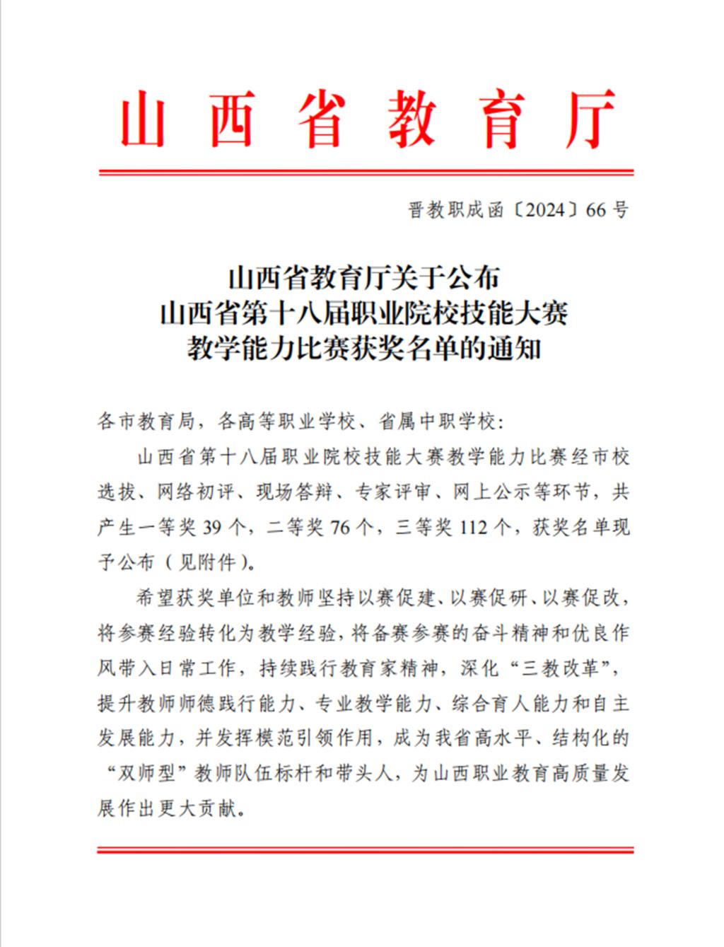 9月9日,山西省教育厅公布了山西省第十八届职业院校技能大赛教学能力比赛获奖名单,由世界杯官网教师张府君主持,郎超、张妤、张孟容参与的团队在此次大赛中齐心协力、努力比拼,斩获高职组一等奖。此外,世界杯官网陈湘玲团队、刘文娟团队、王海花团队、杨兆艳团队也不负众望,分别荣获高职组三等奖。