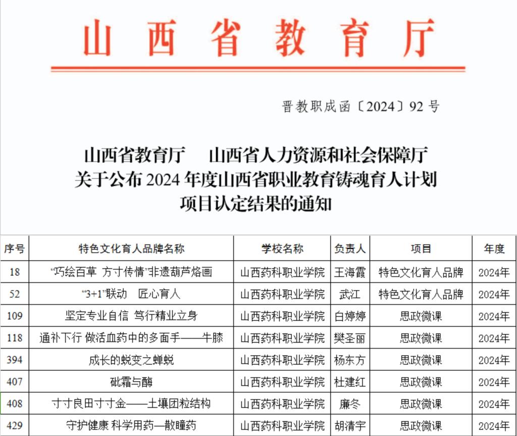 近日,山西省教育厅公布2024年度职业教育铸魂育人计划项目认定结果,世界杯官网铸魂育人“三个一工程”建设喜获佳绩,其中“巧绘百草,方寸传情”非遗葫芦烙画等2个项目被认定为特色文化育人品牌,《坚定专业自信 笃行精业立身》等6个微课被认定为省级职业教育思政微课。