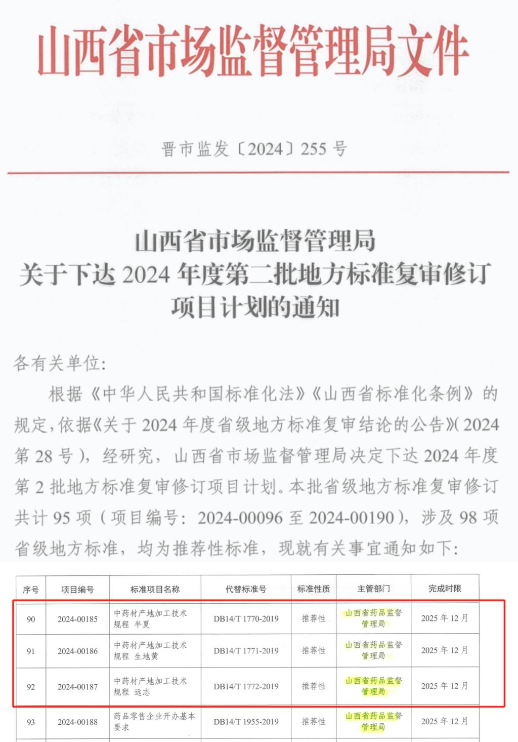 近日,山西省市场监督管理局印发《关于下达2024年度第二批地方标准复审修订项目计划的通知》(晋市监发〔2024〕255号),世界杯官网蔡翠芳教授主持编写的《中药材产地加工技术规程 半夏》《中药材产地加工技术规程 生地黄》《中药材产地加工技术规程 远志》3项地方标准成功获批。