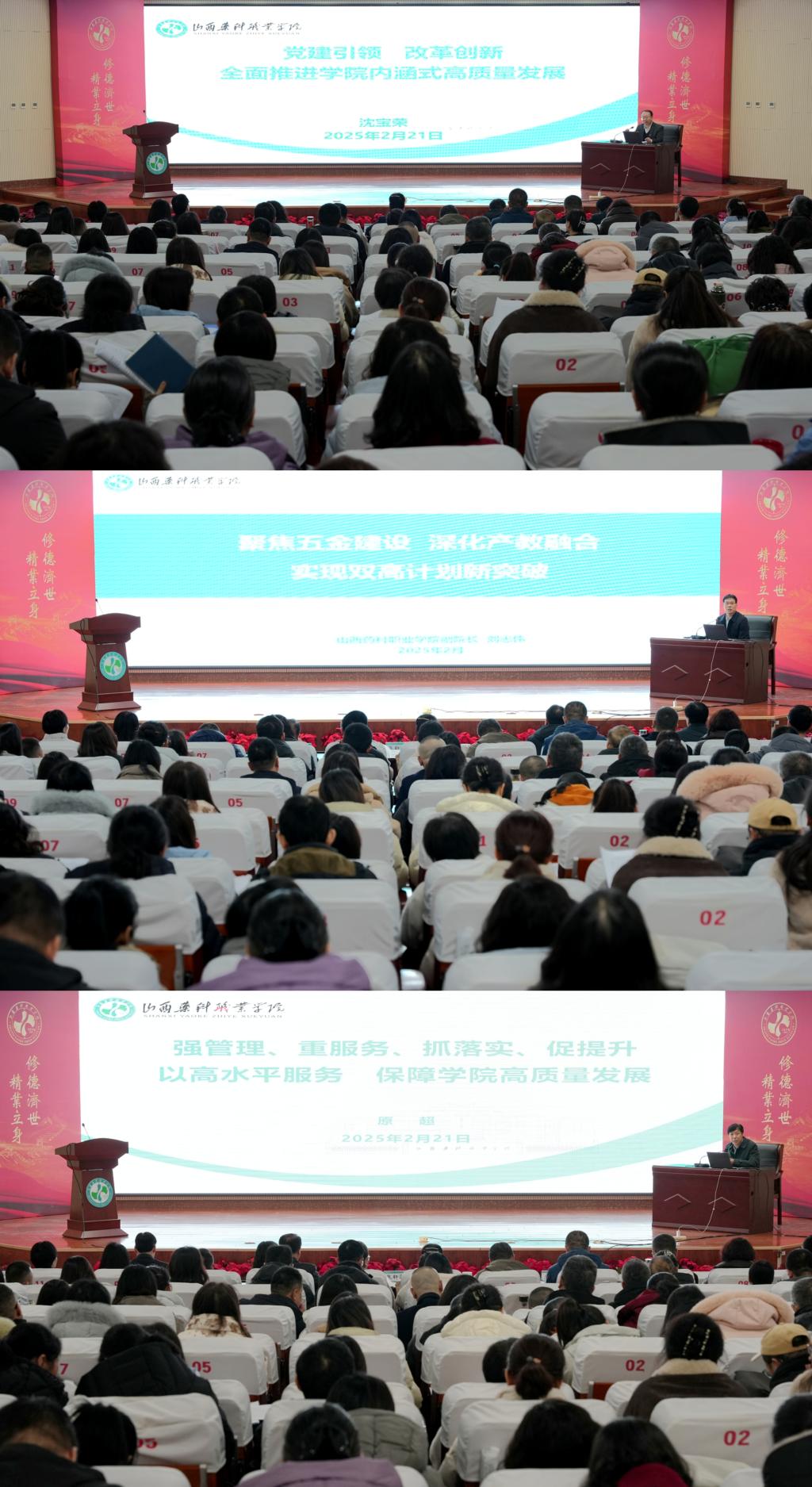 会议号召,全院上下要深入贯彻落实党的二十届三中全会精神和全国全省教育大会精神以及《教育强国建设规划纲要(2024—2035年)》战略部署,以更加饱满的热情,以更加务实的作风,以“开局即决战”的姿态,将会议精神转化为实干成效,推动全年各项工作全面开花、落地见效,全面推进学院内涵式高质量发展,奋力谱写教育强国建设山西药科新篇章。