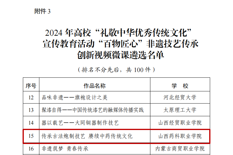 2024年高校“礼敬中华优秀传统文化”宣传教育活动由教育部思想政治工作司主办,以“赓续文化血脉筑牢信仰根基谱写青春华章”为主题,共评选出“创承文脉”高校主题数字微展览联展、“铸魂润心”文化育人创新工作案例及“百物匠心”非遗技艺传承创新视频微课三大类优秀作品各100件,山西省共有5所高校作品入选,其中世界杯官网是唯一一所连续两年参与并获奖的职业院校。自活动开展以来,世界杯官网高度重视,成立了由宣传统战部牵头的工作小组,联动“五育”实践工作室,广泛发动、精心策划、认真准备,经过校内层层筛选,《传承古法炮制技艺 赓续中药传统文化》作为参评作品推荐上报,该作品聚焦于中药炮制技艺这一非物质文化遗产,通过视频微课的形式,生动展现了丸药、线香、倒流香、香囊等中药文化产品制作技艺的历史渊源、技艺流程和文化内涵,同时也彰显了学院在中药学领域的深厚底蕴以及传承和弘扬中华优秀传统文化的使命担当。