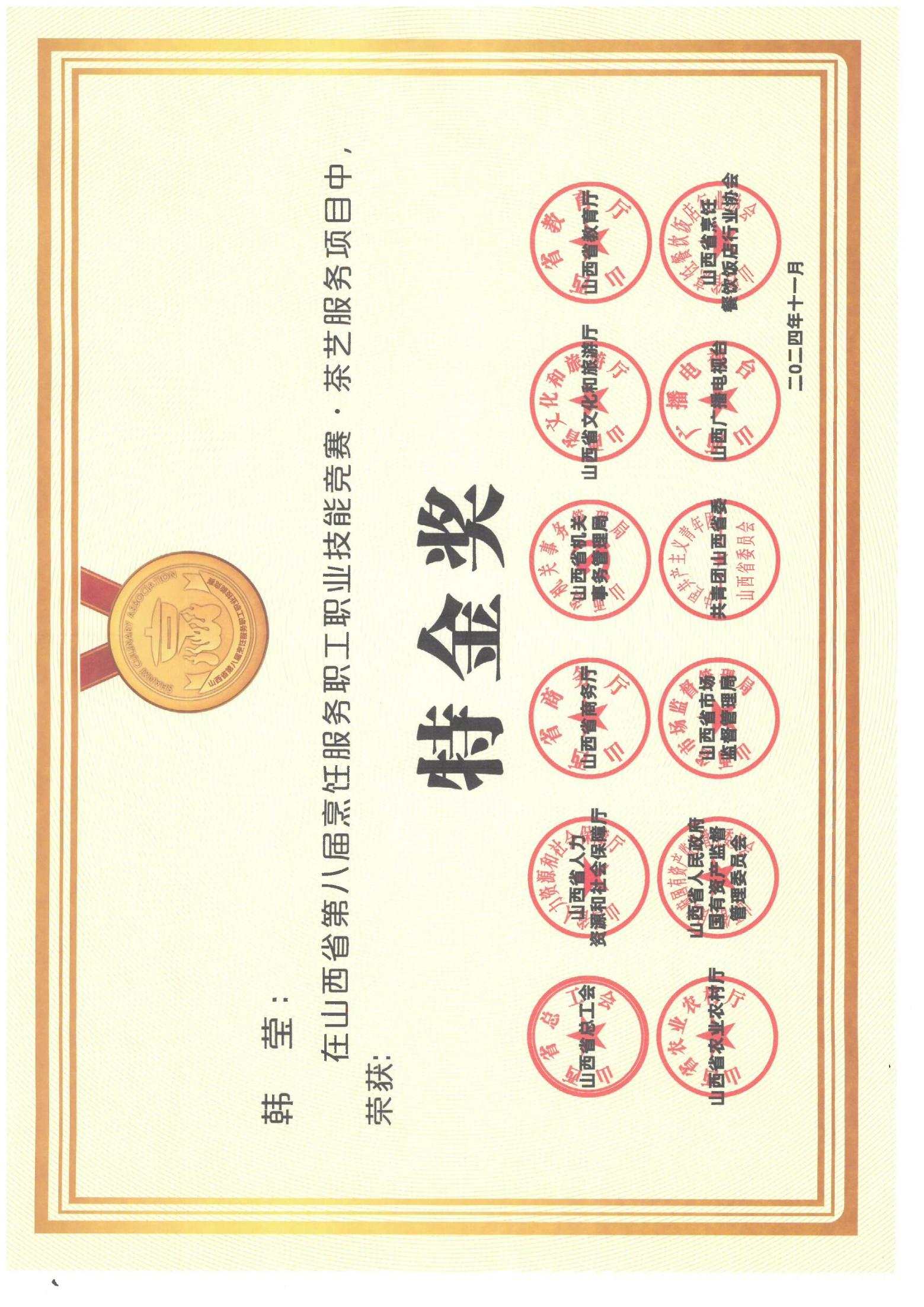 近日,山西省第八届暨全国第九届(山西赛区)烹饪服务职工职业技能竞赛总结颁奖大会在太原并州饭店举行,世界杯官网食品系教师高扬、韩莹在茶艺服务赛项中表现突出,凭借精湛的技艺和深厚的专业素养,在激烈的竞争中脱颖而出,双双荣获“特金奖”,为学院争得荣誉。