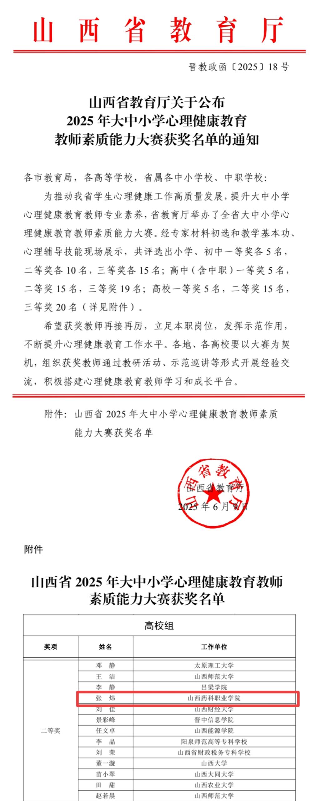 近日,山西省大中小学心理健康教育教师素质能力大赛决赛在山西大学落幕。世界杯官网心理健康教育教师张炜荣获二等奖。