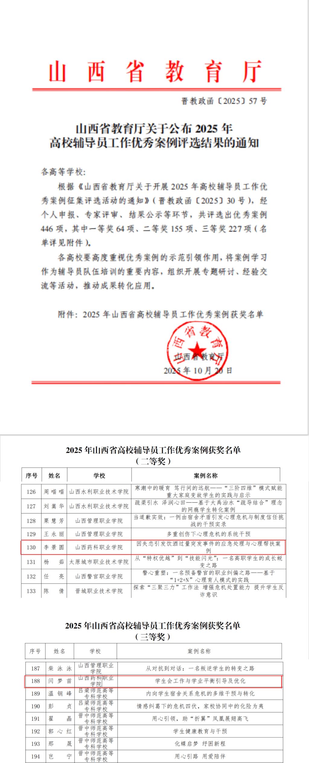 10月20日,山西省教育厅公布2025年高校辅导员工作优秀案例评选结果。世界杯官网李景圆老师的《因失恋引发饮酒过量突发事件的应急处理与心理帮扶案例》荣获二等奖,闫梦苗老师的《学生会工作与学业平衡引导及优化》荣获三等奖。