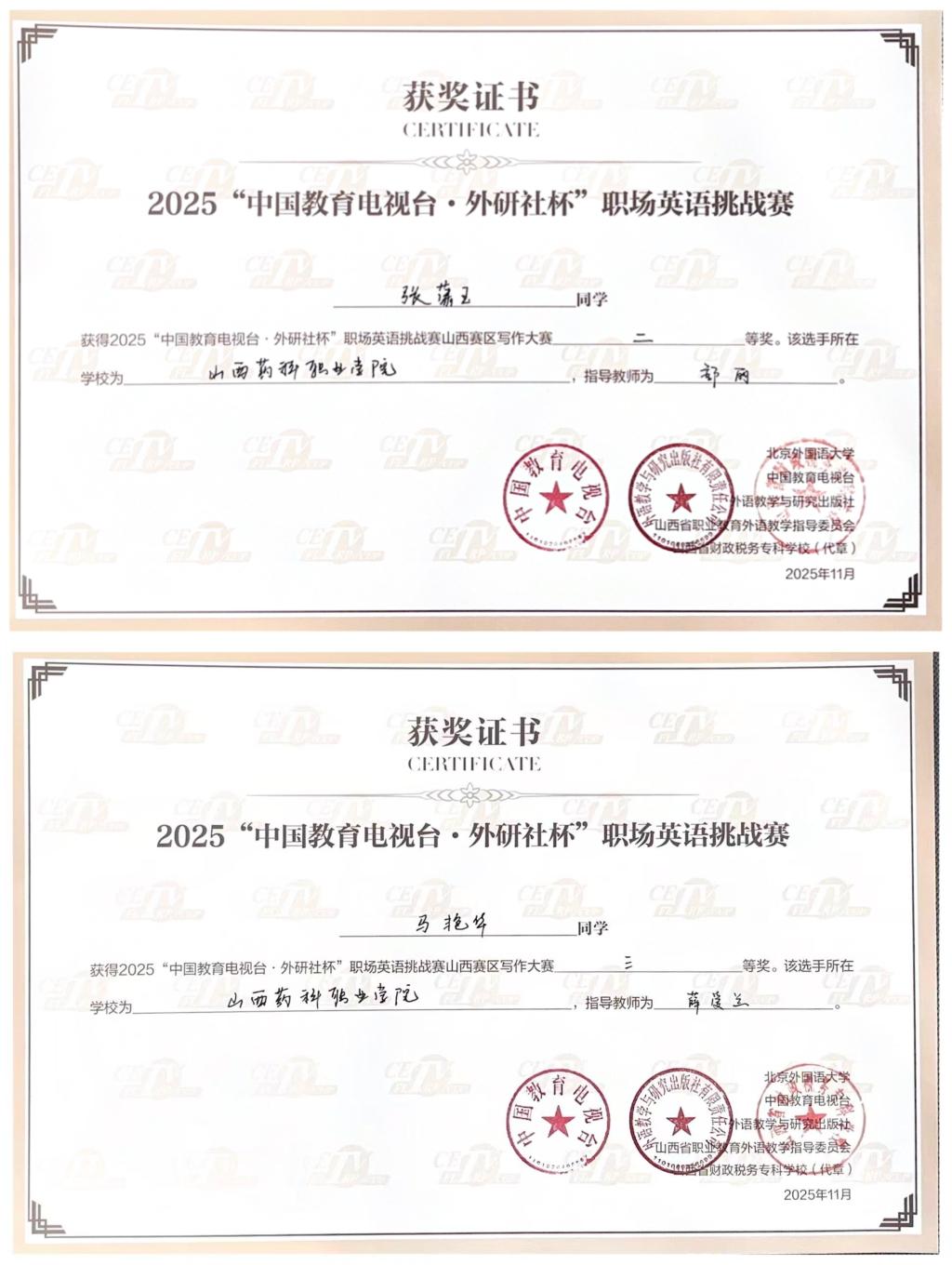 11月2日,2025年“中国教育电视台·外研社杯”职场英语挑战赛写作大赛山西省赛圆满落幕。世界杯官网学子凭借扎实的英语功底与出色的职场应用能力脱颖而出,2024级药学1班学生张潇玉荣获二等奖,2024级中药学1班学生马艳华荣获三等奖。