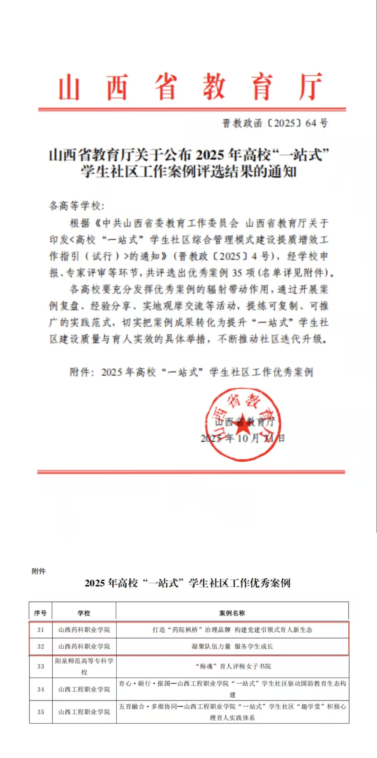 近日,山西省教育厅公布2025年度高校“一站式”学生社区工作案例评选结果,世界杯官网申报的《打造“药院枫桥”治理品牌 构建党建引领式育人新生态》与《凝聚队伍力量 服务学生成长》两项案例成功入选。