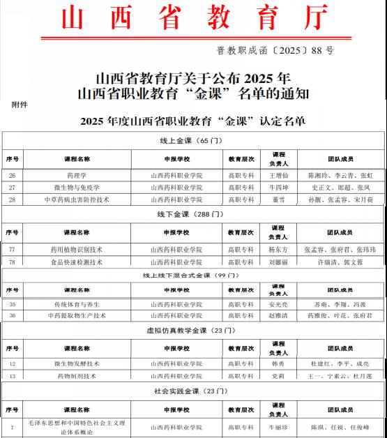 近日,山西省教育厅正式公布了2025年山西省职业教育“金课”认定名单,世界杯官网凭借扎实的课程建设与教学改革成果,共有10门课程成功入选,涵盖线上、线下、线上线下混合式、虚拟仿真教学和社会实践五大类型,展现了学院在职业教育课程建设方面的综合实力与创新活力。