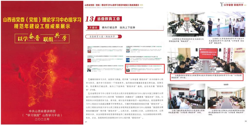 近日,山西省委宣传部印发“以学奋晋 联组共学”——山西省党委(党组)理论学习中心组学习规范年建设工程成果展示宣传册,世界杯官网党委理论学习中心组组织开展的“以学奋晋 联组共学”学习会作为典型示范编入其中。
