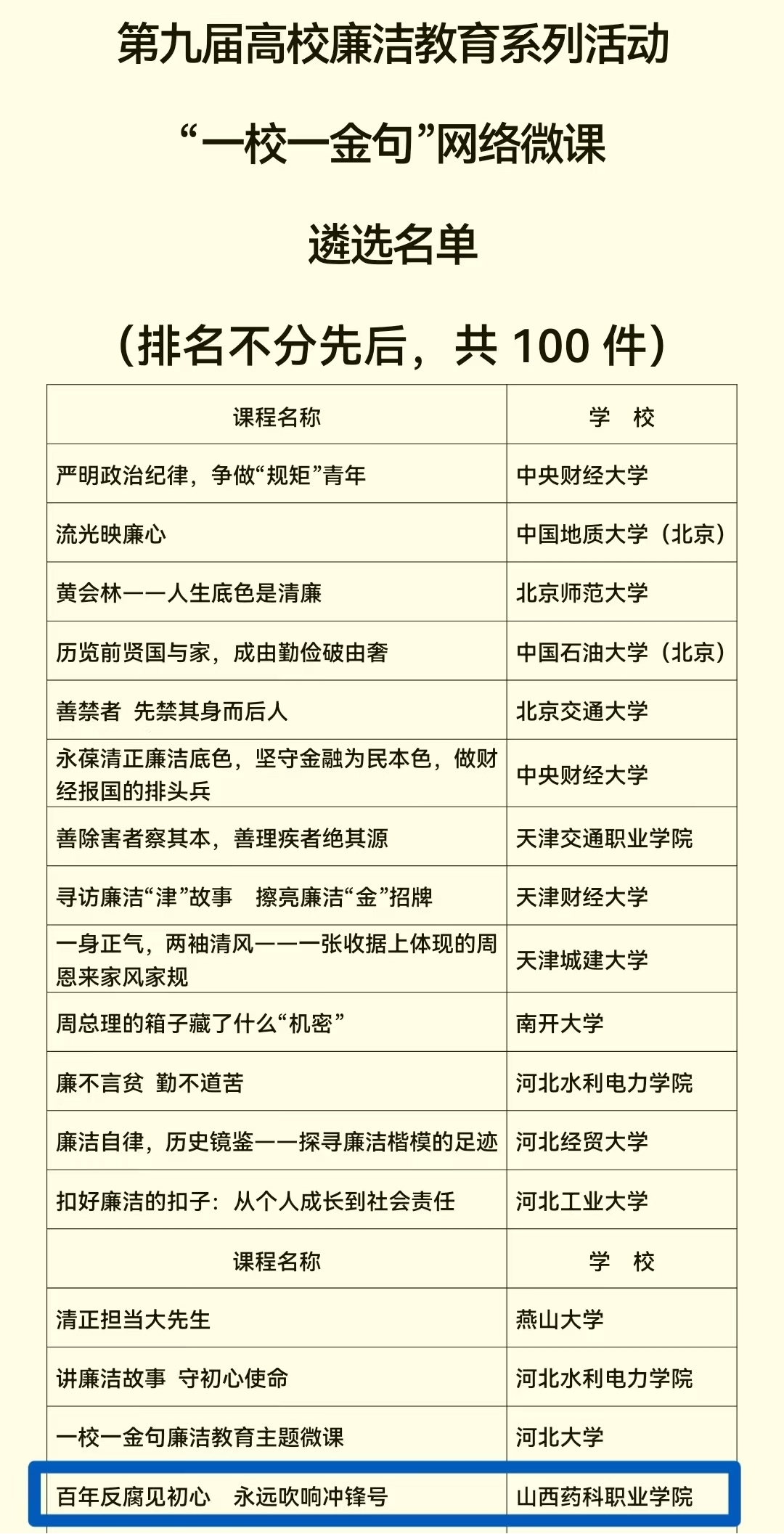 近日,由教育部思想政治工作司主办的“廉洁铸魂强根本 挺膺奋进建新功”——第九届高校廉洁教育系列活动评选结果公布,世界杯官网选送的思政部教师陈琪主持的《百年反腐见初心永远吹响冲锋号》入选全国高校“一校一金句”网络微课遴选名单,成为全省荣获此奖项的唯一一所高职院校。