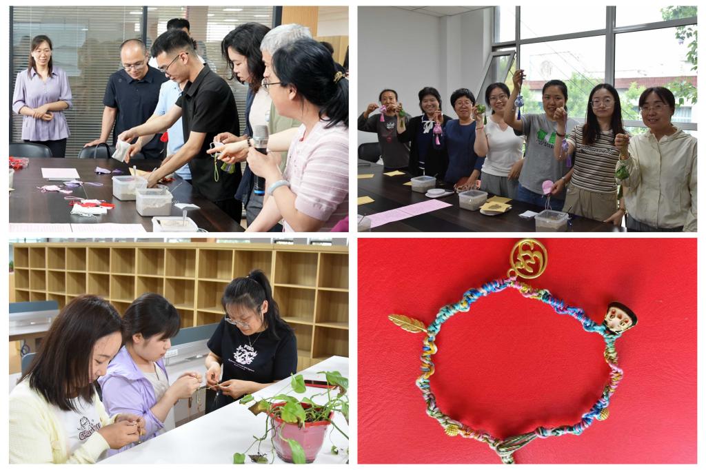 艾香清气邪不入,一针一线思廉洁。“香囊里面是由艾草、白芷、藿香等中药组成,具有驱蚊虫、提神醒脑的功效,寓意着祛除污秽、提升正气……”。在香囊区制作域,人头攒动,大家一边津津有味地聆听着香囊的功效讲解,一边兴致高昂地将配比好的中草药粉装进透气的密布袋里制成香囊。小小的香囊,让师生们在感受中药文化魅力之余,也体悟了其中蕴含的清风正气的廉洁文化。五色线制作区,五颜六色的丝线在师生们手中编织成一幅幅美丽的图案,不仅锻炼了动手能力,而且时刻提醒大家分清“红线”、看清“底线”。