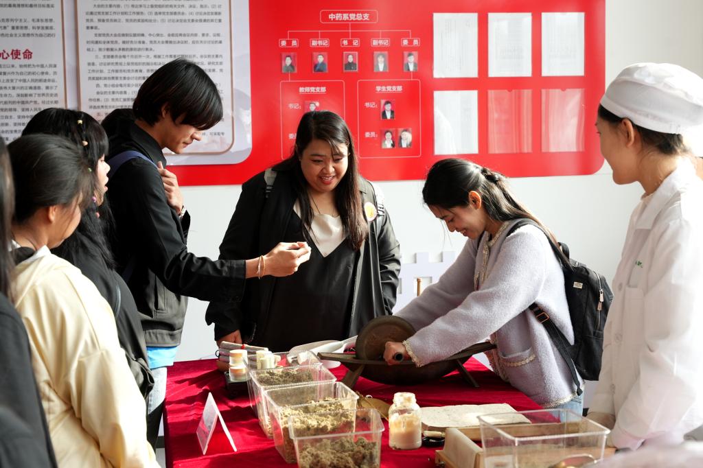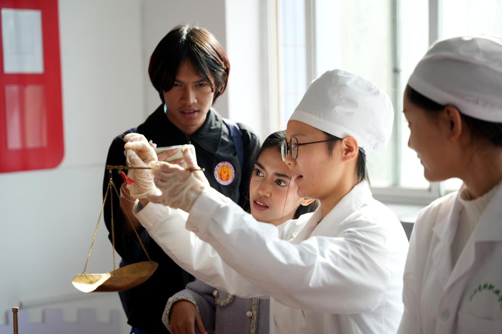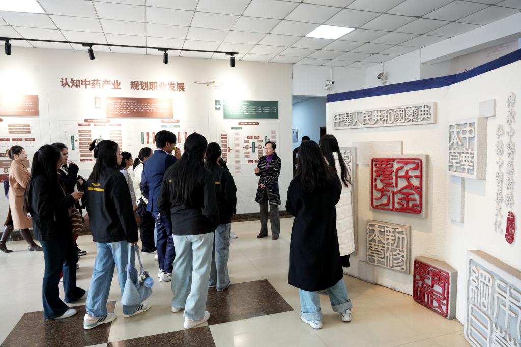 泰国师生实地参观了中药标本厅、中药调剂技艺传承基地、百草大药房、药・茶技能技艺传承与创新实训基地以及传统文化教育学习室等一系列极具中华文化底蕴的育人场所,世界杯官网讲解员为其详细介绍了中医药文化的丰富内容和深厚内涵,使其对我国中药传统文化、中医传统调剂技艺以及传统茶文化有了更为直观和深刻的理解。