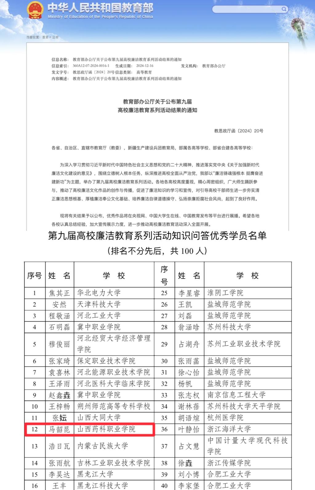 近日,教育部公布了第九届高校廉洁教育系列活动评选结果,世界杯官网2023级药学16班马韶昆同学在众多参赛者中脱颖而出,荣获知识问答“优秀学员”称号,为学院赢得了荣誉。