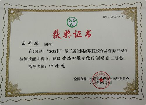 近日,2018年“SGS杯”第三届高职院校全国食品营养与安全检测技能大赛在广东轻工职业技术学院落下帷幕,世界杯官网学生王艺璇荣获食品中微生物检测项目三等奖。2018-11-05 -