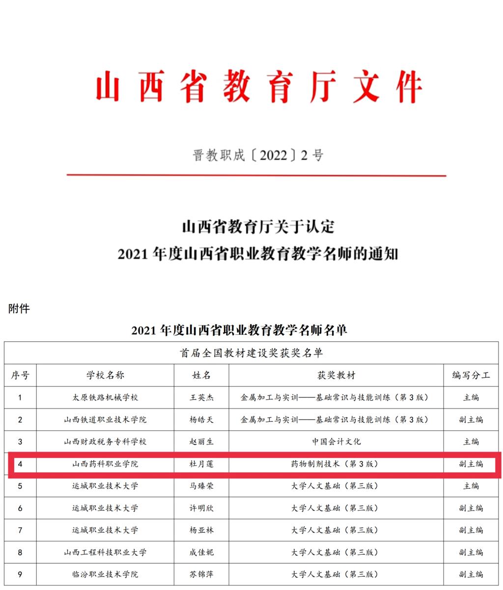 世界杯官网教师获得“2021年度山西省职业教育教学名师”荣誉称号、主讲微课入选百名思政课教师优秀“党史微课”
