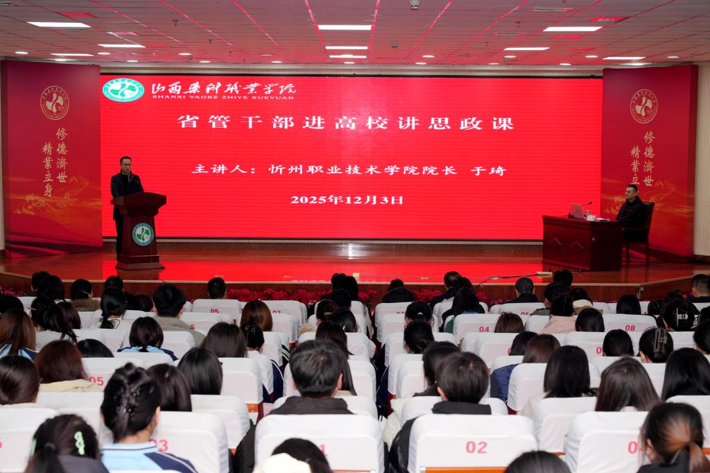 为进一步落实习近平总书记关于学校思政课建设的重要指示精神,充分发挥领导干部在理论宣讲和政策阐释中的示范带动作用,12月3日,学院特邀忻州职业技术学院党委副书记、院长于琦教授来我校,为300余名师生代表作专题思政讲座。学院党委副书记、院长关伟主持并讲话。于琦...2025-12-04 -
